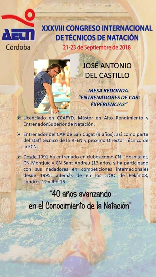 Seguimos añadiendo calidad a la lista de invitados a nuestro XXXVIII Congreso Internacional de Técnicos de Natación AETN, ¿quién será el protagonista en esta ocasión? --> José Antonio Del Castillo "Kasti" participará en la Mesa Redonda "Entrenadores de CAR: Experiencias" junto a Serafín Calvo y un ponente más al que os presentaremos más adelante.