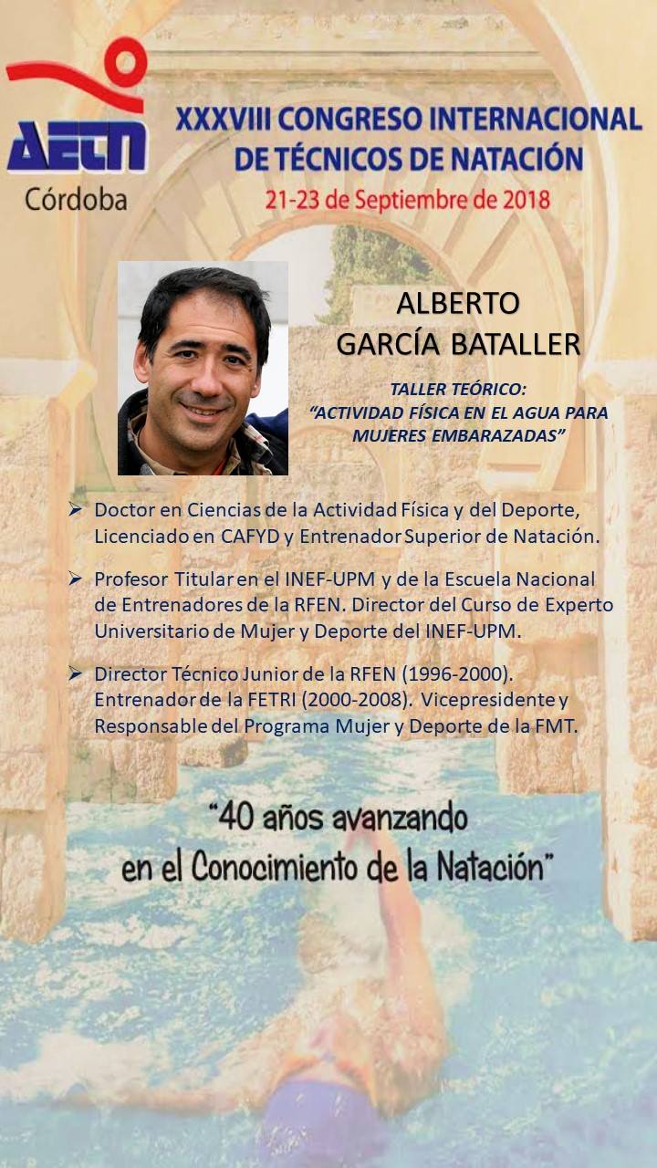 Del siguiente ponente hemos aprendido sobre el Entrenamiento en Altura, sobre el Entrenamiento en Triatlón, sobre Planificación del Entrenamiento para Mujeres .... Pero no satisfecho con ello, ahora tendremos la suerte de que Alberto García Bataller venga a Córdoba a hablarnos de la Planificación de la Actividad Física en el agua para Mujeres Embarazadas en un Taller Teórico en el XXXVIII Congreso Internacional de Técnicos de Natación AETN del 21 al 23 de Septiembre de 2018.