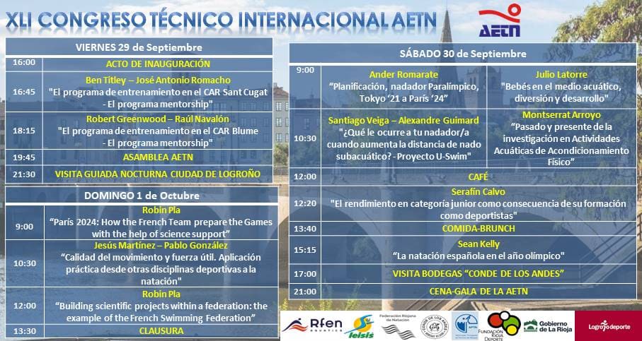 Este es el horario de actividades programadas para el XLI Congreso técnico internacional de la AETN. Esperamos que sea de vuestro agrado y que lo disfrutéis entre amigos. Nos vemos en Logroño.