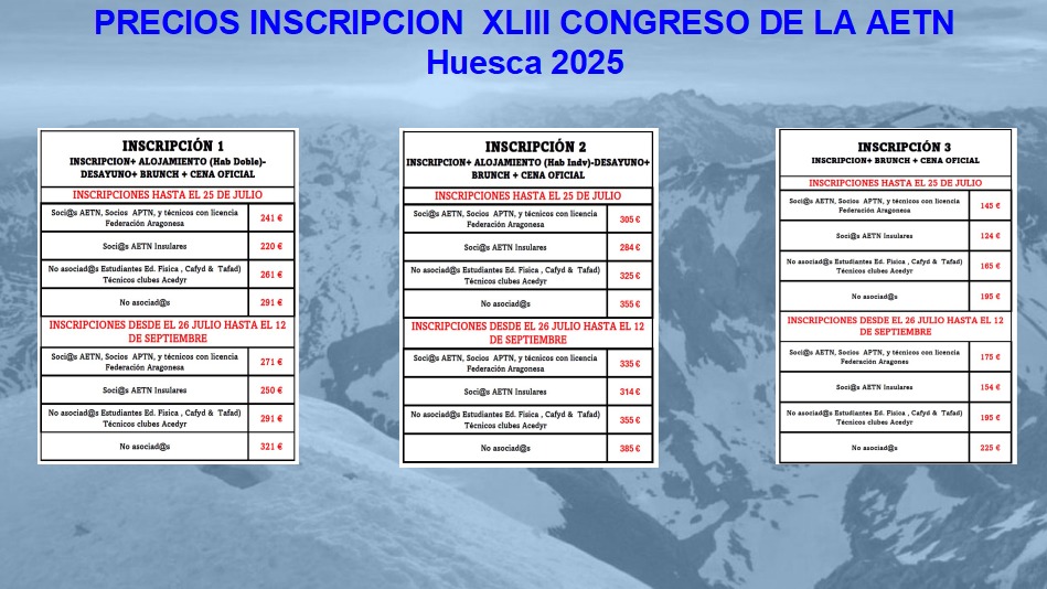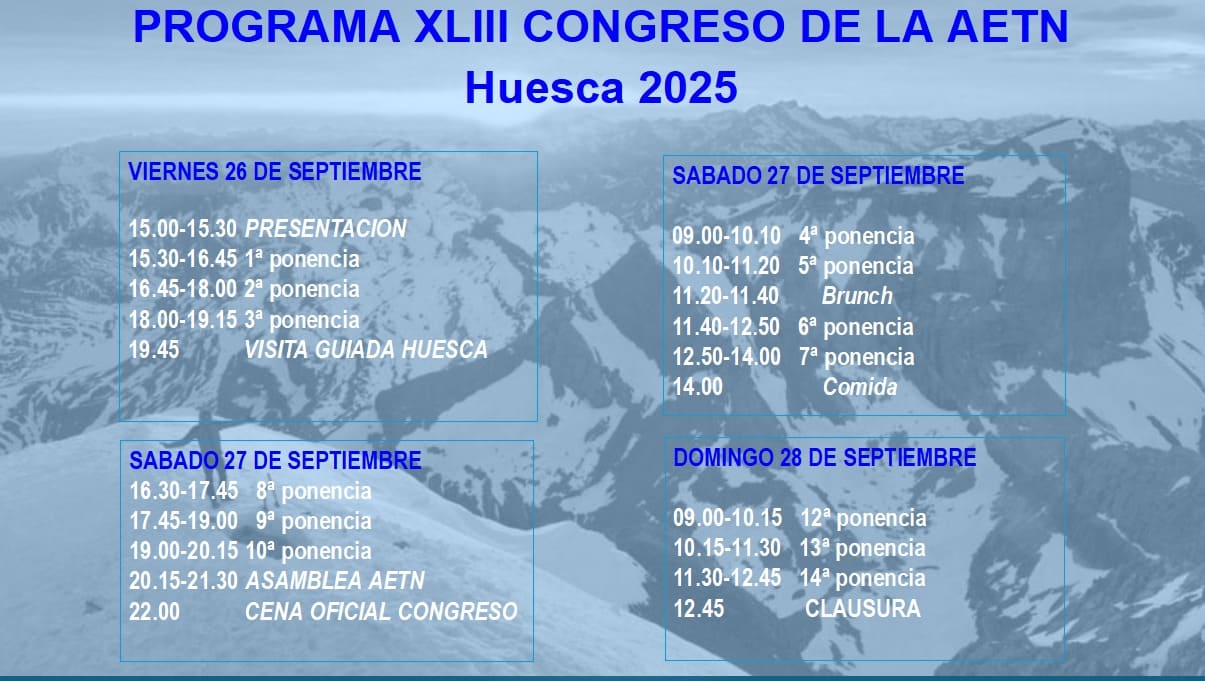Inscríbete en el formulario de inscripción al XLIII Congreso de la AETN 2025 - Huesca del 26 al 28 de septiembre, abona la inscripción antes del 25 de Julio para beneficiarte del mejor precio: